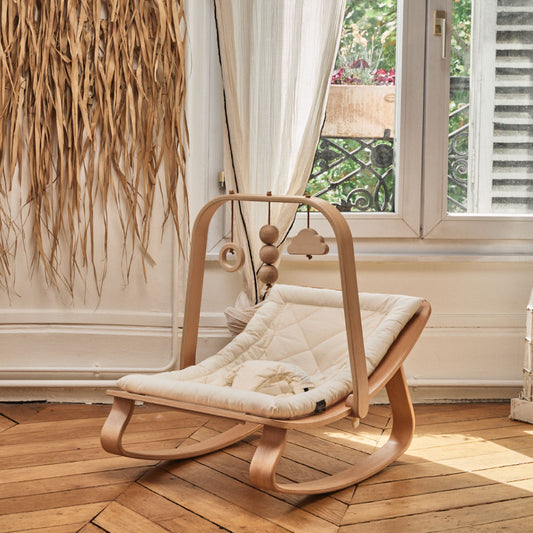 生まれたその日から使えるベビーロッカー。赤ちゃんの動きに合わせてまるで抱っこされているような揺れ方で自然な動きが居心地の良さを生み出しています。